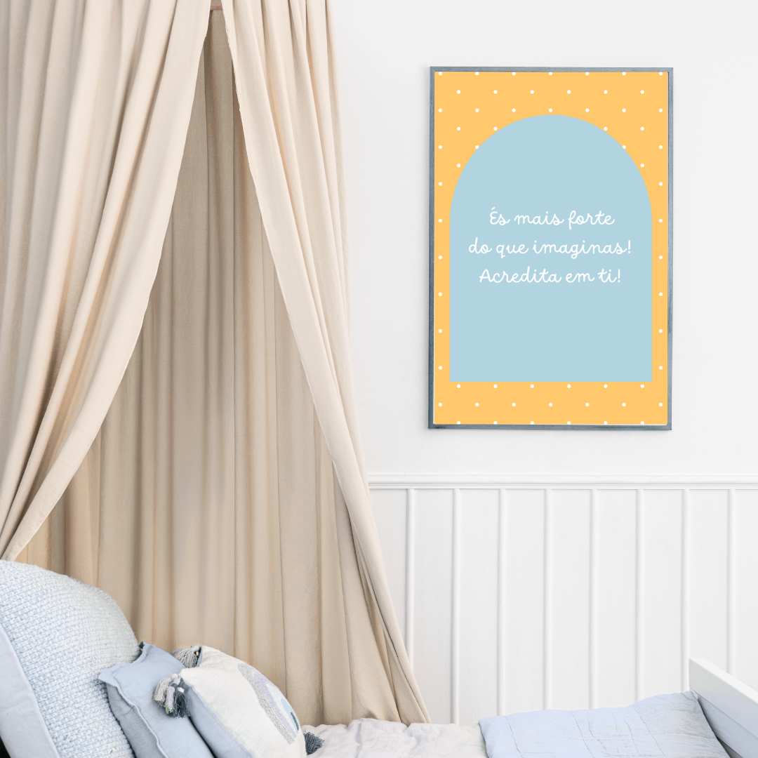 Nos nossos posters infantis, a imaginação dos mais pequenos ganha vida com cores vibrantes e personagens mágicos. Cada peça é criada para ser uma extensão da personalidade única da criança, transformando o seu quarto num lugar especial, cheio de histórias e aventuras. Seja um reino encantado, um céu estrelado ou um mundo de fantasia, os nossos quadros capturam sonhos e refletem o que há de mais puro e especial em cada criança: sua própria essência.