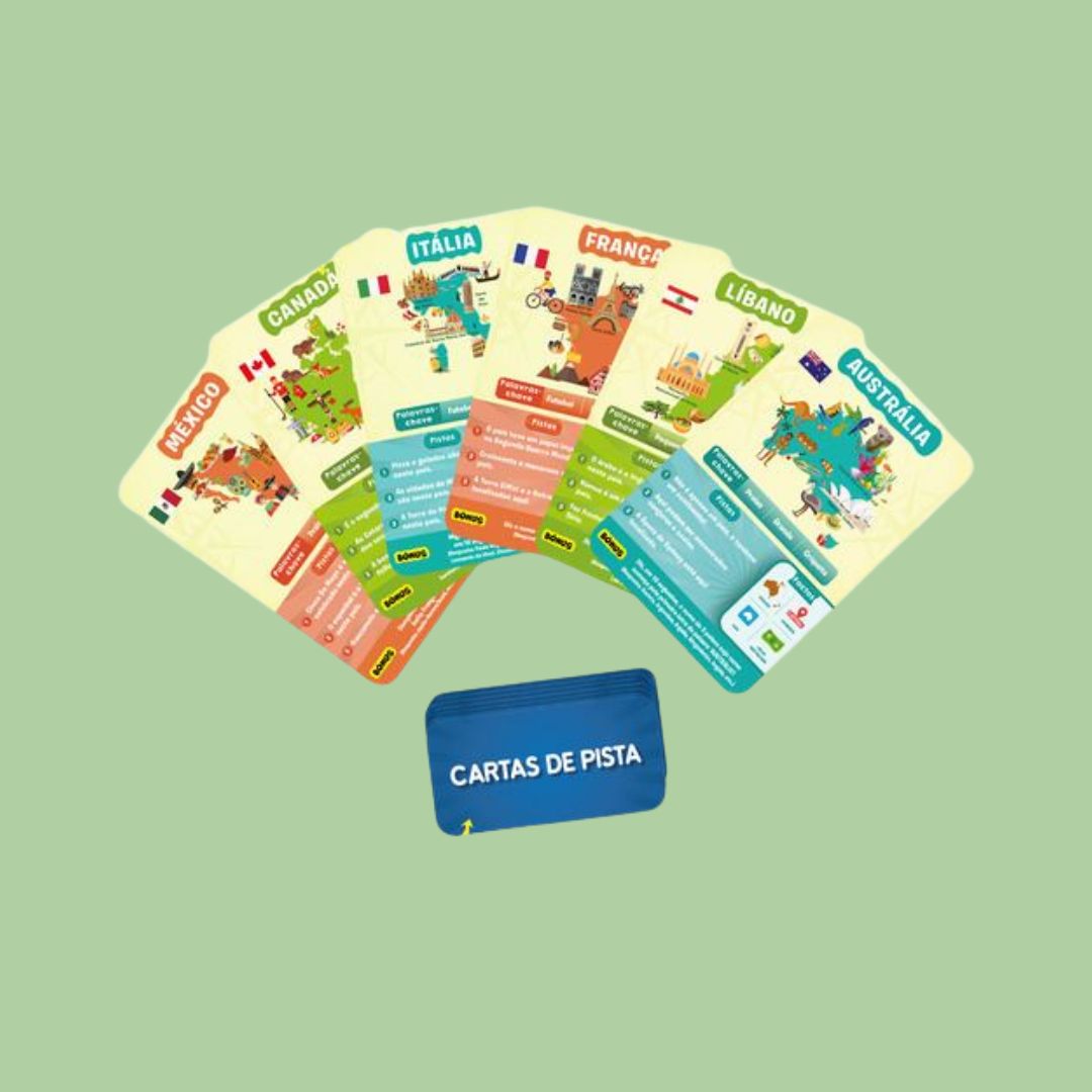 Faz até 10 perguntas para adivinhares o país que está na Carta de Jogo! É uma ilha? É um país da América do Sul? As pessoas pagam em euros neste país?Pensa bem, faz perguntas inteligentes, usa as tuas Cartas de Pista de forma sábia, e sê o primeiro a ganhar 7 Cartas de Jogo!