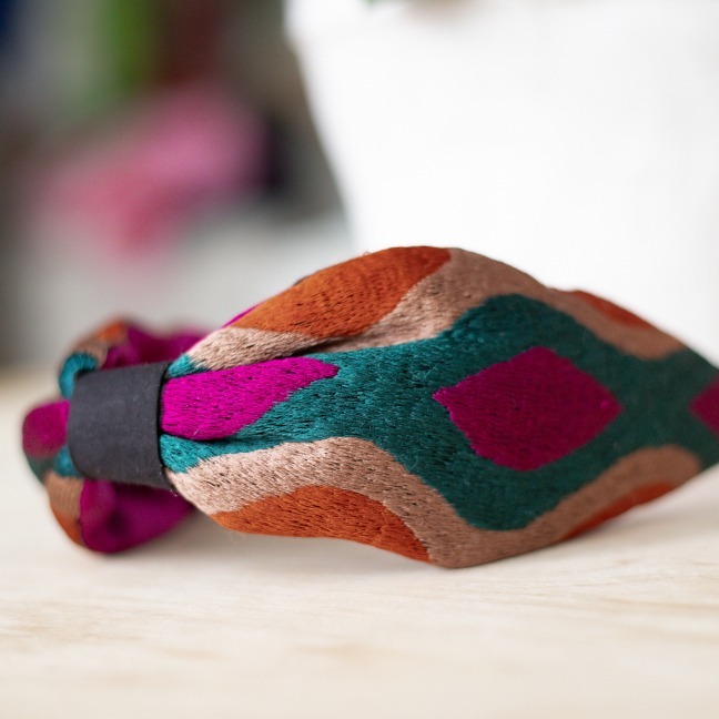 Bandoletes multicoloridas em zigzag bordadas à mão com uma mistura de tons quentes.