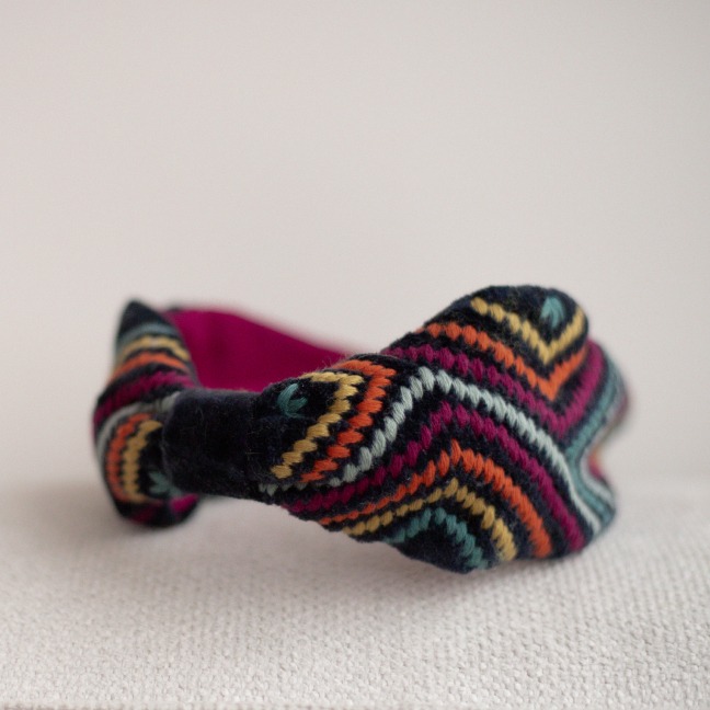 Bandoletes com base aveludada em castanho ou azul escuro com fios em tons alegres bordados à mão.