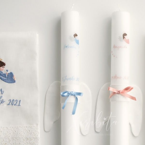 Toalha personalizada com moldura igual à vela escolhida, nome do bebé/criança e data do batizado.