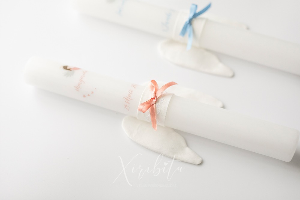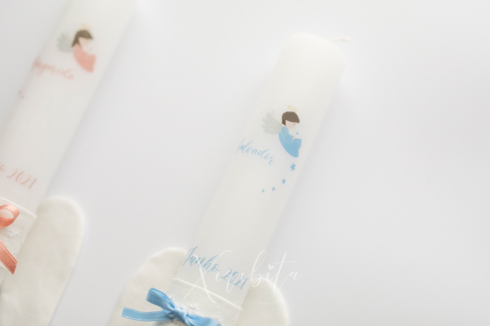 Vela de batismo com 30cm de comprimento e 3,5cm de espessura.