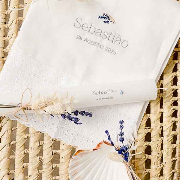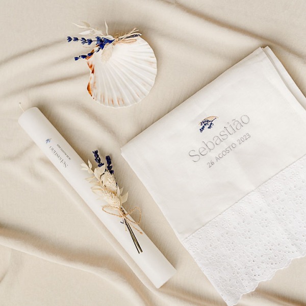 Toalha personalizada com moldura igual à vela escolhida, nome do bebé/criança e data do batizado.