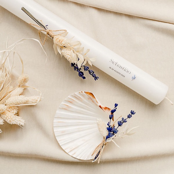 Vela de batismo com 30cm de comprimento e 3,5cm de espessura.