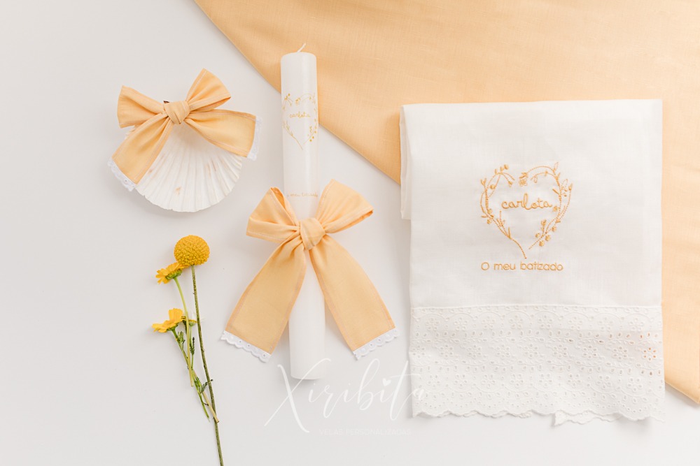 Toalha personalizada com moldura igual à vela escolhida, nome do bebé/criança e data do batizado.