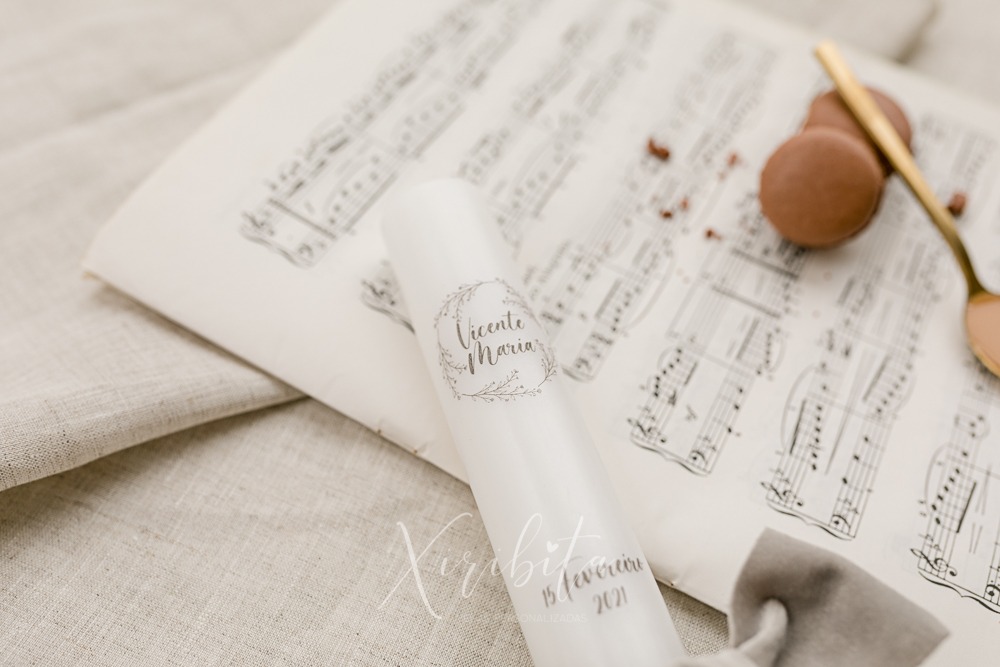 Vela de batismo com 30cm de comprimento e 3,5cm de espessura.