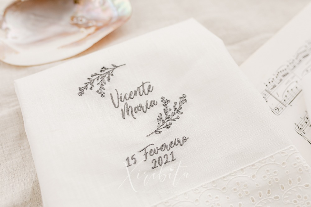 Toalha personalizada com moldura igual à vela escolhida, nome do bebé/criança e data do batizado.